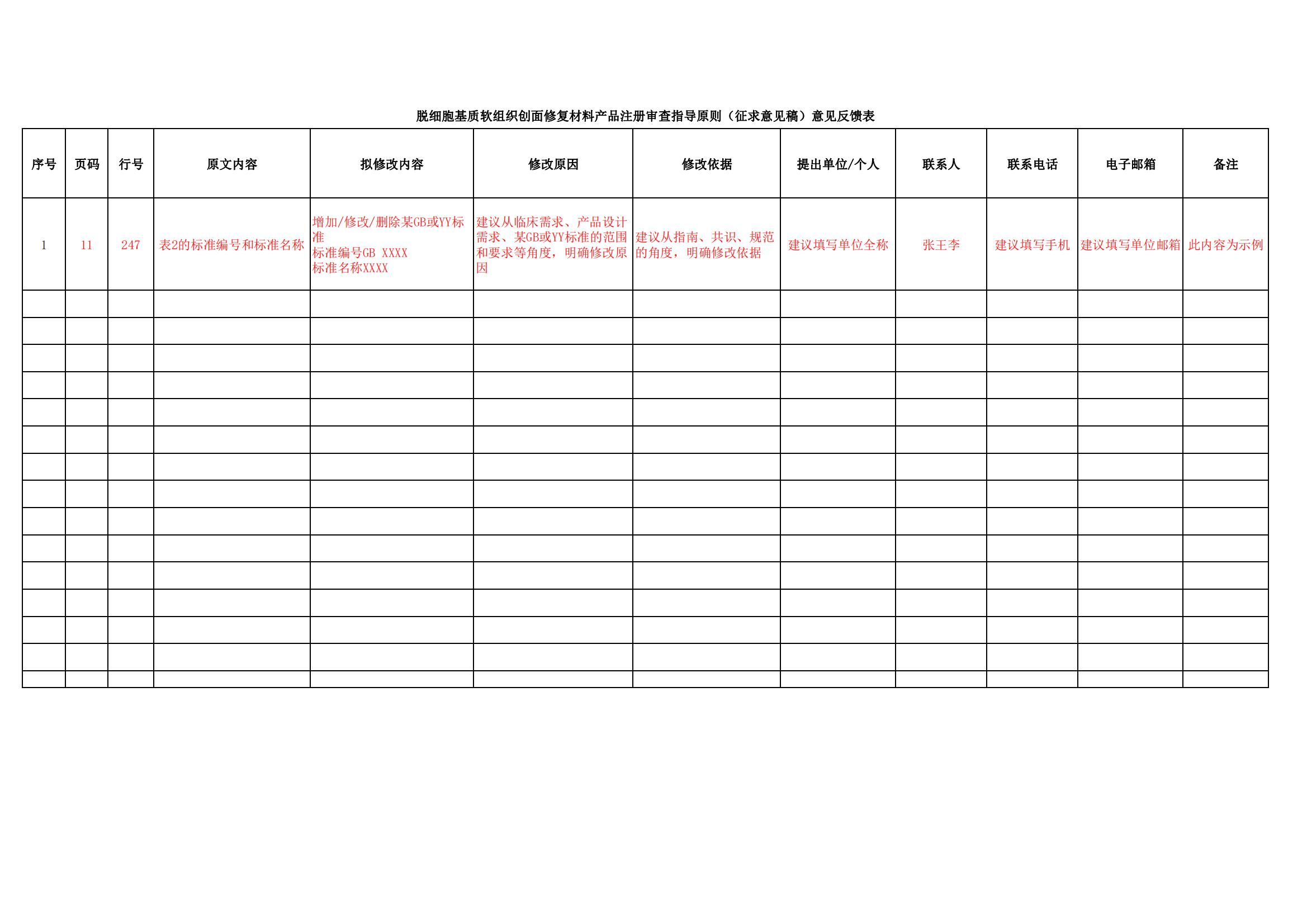 如有意见和建议,请填写意见反馈表(附件2),以电子邮件的形式于2024年5月10日前反馈至我中心。邮件主题及文件名称请以“《脱细胞基质软组织创面修复材料产品注册审查指导原则(征求意见稿)》意见反馈+反馈单位名称”格式命名。